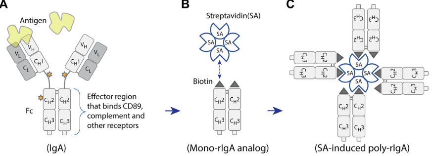 Northwestern researchers have invented a method of inducing IgAN in a rodent using polymeric complexes of homo-oligomeric unglycosylated IgA Fc fragments. Each oligomer contains a biotin moiety enabling streptavidin-induced polymerization, which can be administered to an animal at specified dosages and schedules. Experimental data demonstrate that poly-rIgA injection produces prominent mesangial IgA deposition, mesangial hypercellularity, matrix expansion, IgG co-deposition, complement C3 activation, proteinuria, and electron-dense deposits resembling human IgAN pathology, while monomeric rIgA controls show no such effects, with deposits clearing over 14 days after cessation mimicking disease flare-up and resolution dynamics.