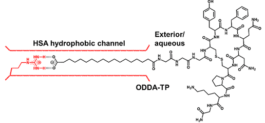 Northwestern researchers have designed a novel drug carrier system based on naturally evolved interactions between long-chain fatty acids (LCFAs) and Human Serum Albumin (HSA). Mono-functionalizing octadecanedioic acid (ODDA) with terlipressin produces a prodrug that is capable of binding to HSA and shows differentiated pharmacokinetics, as well as remarkable tolerability. The fatty acid moiety interacts with human serum albumin (HSA), a ubiquitous protein in the body. The terlipressin-HSA conjugate is more stable than terlipressin alone, allowing the drug to avoid degradation and elimination. Currently, terlipressin requires intermittent IV administration, but with this novel carrier system would enable less frequent dosing, overcoming a significant drawback of terlipressin therapy.