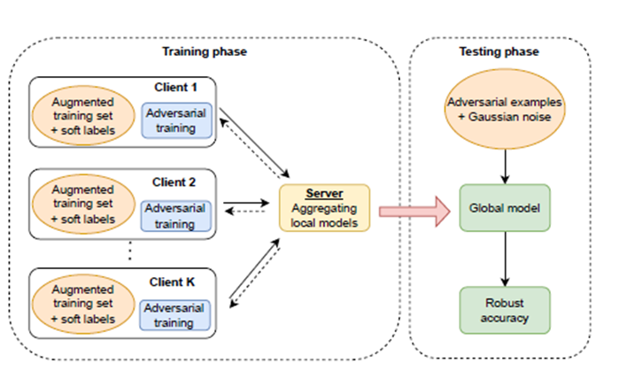 The system diagrams illustrate a multi-client federated adversarial training architecture where each client independently augments its local data with adversarial examples, Gaussian noise, and soft labels, then sends trained model parameters to a central server for aggregation into a globally robust ML model evaluated against multiple adversarial attacks.