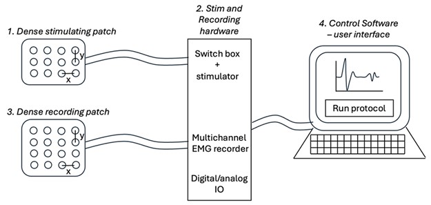 The figure shows the components of the invention. The device consists of a dense stimulating patch and a dense recording patch, comprising a grid of electrodes spaced in the medial/lateral (x) and superior/inferior (y) locations. Each electrode is connected to the stimulating and recording box. Data is then fed into control software, where the user can visualize results and perform test protocols. Intellectual Property: