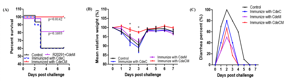 Immunizations of mice with CdeCM provide significant protection against infection with C. difficile: CdeCM‑vaccinated mice demonstrate markedly improved survival, reduced disease severity, and lower rates of weight loss and diarrhea following challenge with the hypervirulent R20291 strain.