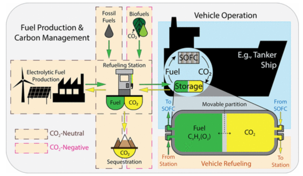 This invention presents an integrated energy storage system that co-stores a renewable liquid hydrocarbon fuel and its CO2-rich exhaust generated by a solid oxide fuel cell (SOFC), delivering a CO2-neutral or negative solution for transportation. The system captures CO2 on-board in a compact co-storage tank, aiding in emission reduction and potential fuel regeneration.