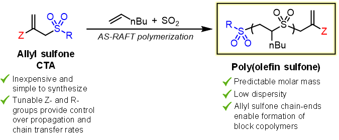 Poly(olefin sulfone)s (POSs) offer a uniquely tunable combination of high polarity, high glass transition temperatures, thermal and oxidative stability, and chemical robustness, enabling potential applications in semiconductor technologies, advanced battery components, high-performance gas-separation membranes, and next-generation engineering plastics. Derived from cheap and abundant monomers—alkenes and sulfur dioxide—POSs have the potential to replace legacy materials and enable new technologies. Additionally, they can be degraded back to monomers under alkaline conditions or irradiation at elevated temperatures. However, their widespread adoption has been limited by the difficulty of achieving controlled and predictable molecular weights, managing side reactions and degradation pathways, and reliably producing materials with targeted molecular weights and properties. Current free radical polymerization methods cause the polymers to grow at unequal rates, leading to extremely high molecular weights and broad size distributions, which translate into inconsistent performance and limited ability to design advanced products. A lack of reactive chain ends enabling the formation of POS block copolymers has also prevented their application to materials with nanoscale features.
