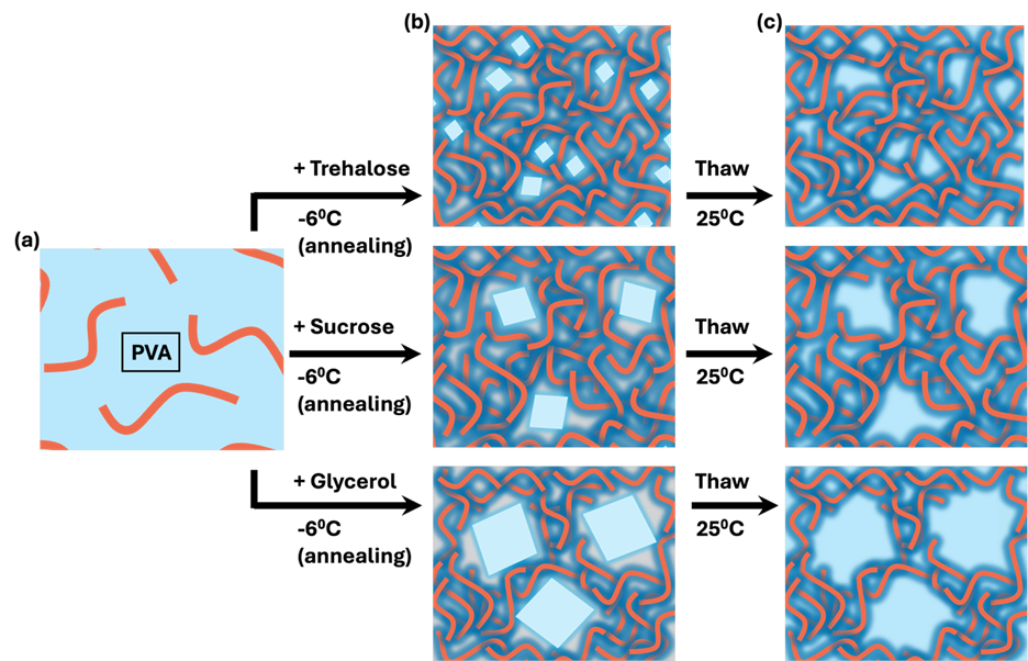 This invention describes a novel hydrogel made from poly(vinyl alcohol) PVA and trehalose that protects biological materials against ice damage. It works by controlling the size of the growing ice and preventing ice damage. This hydrogel can cryopreserve cells and tissues, stabilize sensitive biomolecules, and extend the shelf life of biopharmaceutical products, offering a non-toxic solution for bio-storage.