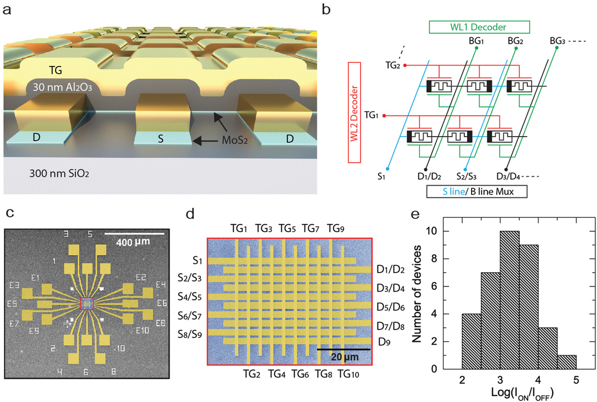 (a) Schematic illustration of a dual-gated MoS2 memtransistor crossbar array with global silicon back gate and local top gate electrodes. (b) Diagram of the dual-gated memtransistor crossbar array. (c) False-colored scanning electron microscopy (SEM) image of a 10 x 9 crossbar array. (d) Zoomed-in SEM image of the active area indicated by the red rectangle in (c). (e) Histogram of the switching ratio of 34 MoS2 memtransistors.