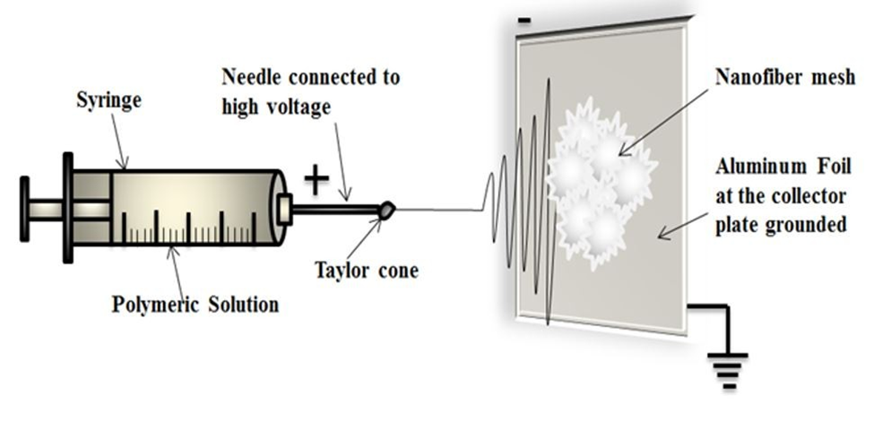This figure shows the electrospinning setup showing how a high-voltage electric field draws a polymeric solution into fine nanofibers, which solidify into a mesh on the collector plate for use in multilayer drug-delivery membranes.