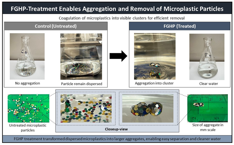 Figure: Schematic and experimental demonstration of microplastic removal using food-grade hydrophobic polymer (FGHP). In the untreated control, microplastic particles remain dispersed in water with no visible aggregation. Upon FGHP addition, hydrophobic interactions induce rapid coagulation, forming larger, dense aggregates. Close-up views highlight the transition from dispersed particles to compact clusters, with aggregate sizes reaching the centimeter scale, enabling simple separation and resulting in visibly clarified water.