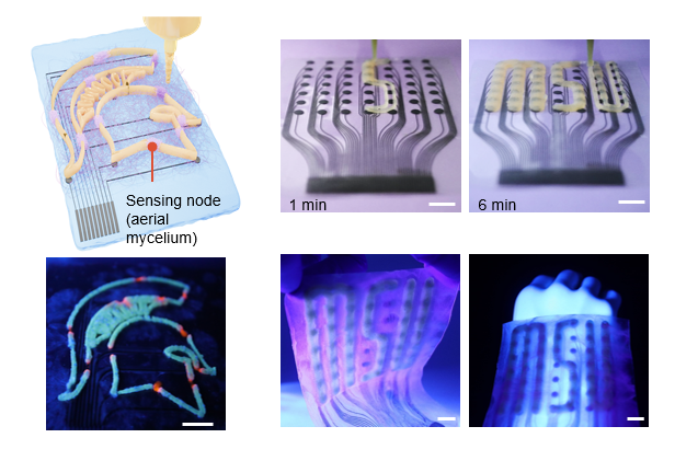 This innovation integrates laser-induced graphene (LIG) electrodes with bioprinted living fungal material, creating a novel Mycoelectronic sensor. The fungi’s inherent capability to convert heat into electrical signals via heat-induced vacuole remodeling enables precise thermal sensing. The system is flexible, adaptive, and capable of autonomous circuit growth and repair through tip-guided extension and context-dependent branching. Tested applications include: