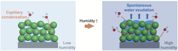 A nanoparticle-polymer film enables isothermal droplet formation and water recovery from humid air through capillary condensation on a porous surface. Problem: Conventional condensation of undersaturated water vapor can require energy-intensive cooling. Porous materials can condense water without cooling but often retain it inside voids. That makes harvested water difficult to access. Improved approaches are needed for water harvesting and macroscopic droplet formation. Solution: The technology uses a heterostructured film containing hydrophilic nanoparticles and a solidified hydrophobic polymer. The film is configured to effect capillary condensation and form droplets on a porous surface. Condensed water can overflow from interstitial spaces and become collectable droplets. This method enables isothermal recovery of water from humid air. Technology Overview: The film includes a bed of hydrophilic nanoparticles with interstitial spaces between them. A solidified hydrophobic polymer bridges adjacent nanoparticles, partially fills some interstitial spaces, or both. The film surface is porous, and its pores are in fluid communication with at least some interstitial spaces. In use, atmospheric water condenses within the film and forms droplets on the porous surface. Advantages: