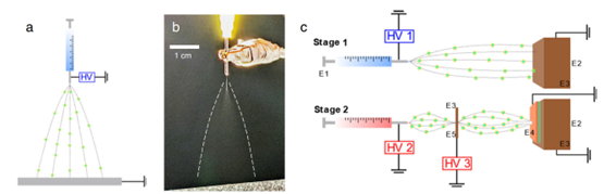 Schematic of the electrospray setup. (a) Schematic and (b) photograph of an electrospray deposition experiment. White dashed lines are provided as a guide to the eye of the plume. (c) Schematic of the improved spray system and process, highlighting different enhancements (E#). In stage 1, a negative polarity spray (E1) is sprayed directly at a large extractor ground (E2) coated in insulator (E3). In stage 2, a grounded target with an insulating mask (E4) is placed on the extractor ground (E2). It is then sprayed by the spray solution at positive polarity which is stabilized by a focus ring (E5).