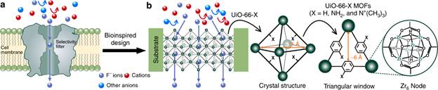 Figure 1: a) Schematic of a biological fluoride (F−) ion channel with an angstrom-sized region as F− selectivity filter and nanometer-sized vestibule and outlet for selective, ultrafast F− transport. b) Schematics of bioinspired artificial zirconium-based UiO-66-X (X = H, NH2, and N+(CH3)3) MOF channels with sub-1-nanometer crystalline pores for selective and ultrafast F− transport. Sub-1-nanometer MOF channels consist of angstrom-sized triangular windows (~6 Å in diameter) for ion sieving and nanometer-sized octahedral cavities (~11 Å in diameter) for ultrafast ion conduction.