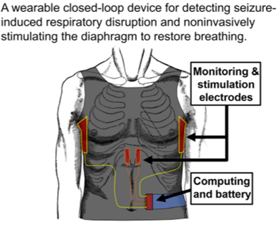 Rutgers researchers have developed an innovative technology that provides a non-invasive solution to sudden unexpected death in epilepsy (SUDEP) by using a closed-loop system that monitors breathing, detects respiratory arrest during a seizure, and stimulates the phrenic nerve via skin-level electrodes to induce diaphragm contractions and resume breathing. Unlike traditional implants, this device employs wearable cutaneous electrodes embedded in a garment, improving safety and accessibility. Proven effective in preclinical mouse models, it offers ventilatory assistance without requiring surgical implantation, using intelligent seizure detection and precise electrical stimulation to ensure efficient intervention only when needed.