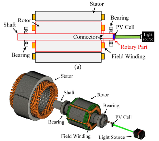 This technology is based on a brushless wound‑field synchronous machine in which rotor field excitation is supplied through an optical power transfer system. A stationary light source delivers power to a photovoltaic (PV) cell mounted directly on the rotor shaft, which converts optical energy into DC excitation for the field winding. Compared with inductive or capacitive wireless power transfer systems, the optical approach: