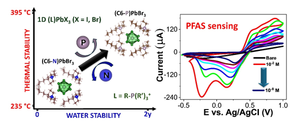 The image illustrates the benefits of replacing conventional ammonium-based ligands with phosphonium-based ones and integrating them into metal halide semiconductor materials with excellent sensitivity towards PFAS molecules in aqueous samples.