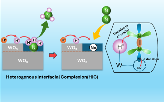 Researchers at Rutgers have developed a system for electrochemical generation of ammonia from N2 and H2O at ambient temperature and pressure using a tungsten oxide (WO3) based catalyst featuring a novel heterogenous interfacial complexion (HIC) structure with tungsten oxynitride (WOxNy). The unique HIC architecture offers two key advantages: (i) WO3 enables in situ generation and delivery of highly active hydrogen atoms (H*) in acidic electrolytes and (ii) H* promotes nitrogen hydrogenation and the formation of nitrogen vacancies (Nv) on the WOxNy surface, which significantly enhances the selectivity of eNRR for NH3 synthesis while suppressing hydrogen evolution reaction (HER). Consequently, both NH3 yield and Faradaic efficiency are significantly improved. Moreover, integration of the HIC catalyst with a non-equilibrium N₂ plasma to pre-activate inert N2 molecules further boosts NH3 production efficiency, providing a promising pathway toward practical, decentralized green ammonia synthesis.