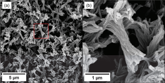 Figure: SEM images of 15 wt.% PEEK aerogel gelled in DPA at (a) 10 kx and (b) 20 kx magnification, with (b) location indicated by red box in (a).
