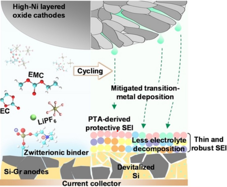 The development of high-energy-density lithium-ion batteries (LIBs) is crucial to meet the growing demand for electric vehicles and portable electronics. Silicon (Si)-based anodes have emerged as promising candidates due to their high theoretical capacity and abundance. However, the practical application of Si-based anodes, particularly when paired with high-nickel layered oxide cathodes, is hindered by significant challenges. Si-based anodes suffer from severe structural and interfacial degradation during cycling. The large volume expansion of Si upon lithiation leads to particle pulverization, continuous solid-electrolyte interphase (SEI) breakdown and reformation, and loss of electrical contact. This degradation is exacerbated by transition-metal crossover from the high-nickel cathode, which catalyzes detrimental side reactions at the anode-electrolyte interface, accelerating capacity fade and shortening battery lifespan. Conventional approaches, such as modifying binder mechanical properties, have proven insufficient in addressing these critical issues.