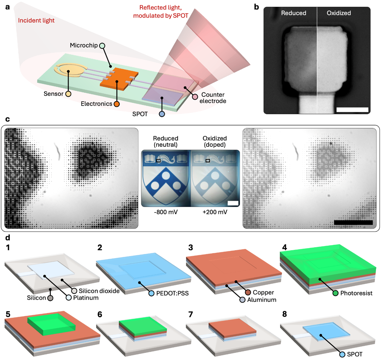 Operation and fabrication of submillimeter polymer optical transmitters (SPOTs). (a) Concept operational diagram for an arbitrary microchip. A sensor makes a measurement, onboard electronics process and digitize the data, and the resulting voltage is applied to the SPOT (a working electrode coated in PEDOT:PSS) relative to a counter electrode in an electrolyte solution. The voltage modulates the stack’s reflectivity and hence the reflected light intensity. (b) Reduced/neutral (left) and oxidized/doped (right) states of PEDOT:PSS (∼45 nm)-Pt stack in 1×PBS, at applied potentials of −800 mV and +200 mV, respectively, relative to an Ag/AgCl counter electrode. The polymer shown is cross-linked by thermal treatment. (c) Demonstration of SPOTs at macroscopic and microscopic scales. Center images show reduced (left) and oxidized (right) states of a cm-scale chip featuring the University of Pennsylvania coat of arms, consisting of individual μm-sized SPOTs determined via Floyd–Steinberg dithering. Far left and right images show enlarged views of the pixelation of the dolphin’s eye in the reduced and oxidized states, respectively. (d) Schematic diagram showing fabrication protocol (vertical heights exaggerated): (1) Begin with bare metal electrode on a Si chip; perform O2 plasma cleaning. (2) Spincoat PEDOT:PSS and bake. (3) Sputter Al and Cu sequentially. (4) Spincoat photoresist. (5) Pattern photoresist. (6) Ion mill through Al, Cu, and PEDOT:PSS. (7) O2-plasma-ash away photoresist from working electrode. (8) Etch away Al and Cu from working electrode in dilute HCl. The device is now complete. Scale bars: (b) 10 μm; (c, center) 3 mm; (c, right) 300 μm. Intellectual Property: