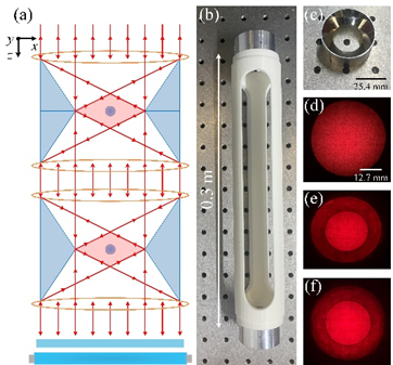 (a) Side-view schematic of dual-MOT. (b) Mounted mirrors. (c) MOT mirror. (d) Incident laser beam. (e) Passing through laser beam after the 1st mirror. (f) Passing-through laser beam after the 2nd mirror.