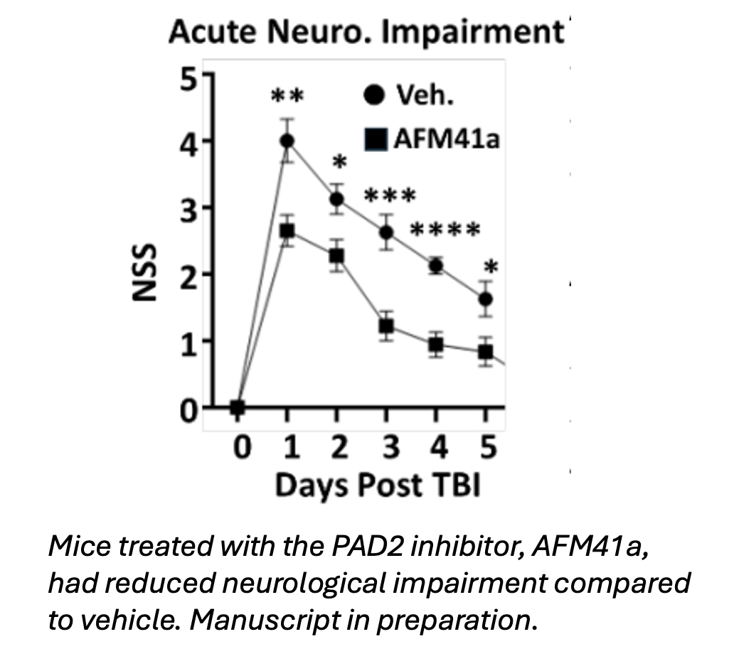 Novel PAD2-selective inhibitor platform targeting neuroinflammation to support both acute neuroprotection and long-term functional recovery as a first-in-class treatment of traumatic brain injury.