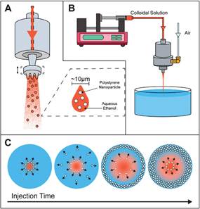 Figure 1: a) Schematic diagram of aerosolizing nozzle generating micron-scale dispensing droplets carrying submicron colloidal particles. b) Schematic diagram of monolayer self-assembly system. c) Process flow showing self-assembly of submicron colloidal particles self-assembling at an air–water interface as a function of injection time. (Left) Atomized droplets of aqueous alcohol dispensing droplets (orange) impinge on the water's surface (blue). The alcohol generates a surface tension gradient (orange) which propels submicron colloidal particles (white) radially away from the impact point. (Right) Over time, continuous injection causes submicron particles to accumulate into an annulus and self-assemble into an ordered monolayer.