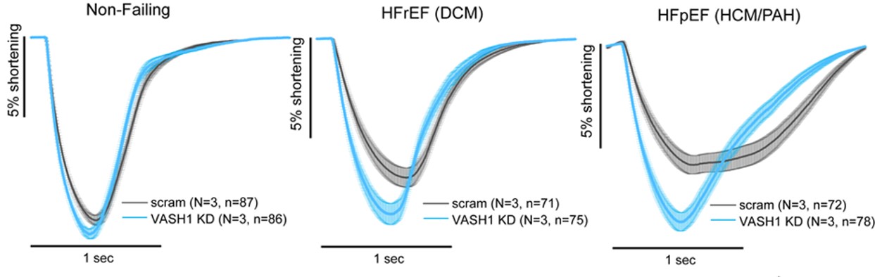 Non-replicating viral delivery of shVASH1 to treat heart failure. Problem: Heart failure (HF) is condition in which the heart cannot pump enough blood throughout the body to meet its need. Approximately 6 million American adults live with the condition, and close to 400,000 people die from it annually. Mainstay treatment for HF are lifestyle changes and medications that include ACE inhibitors, beta blockers, diuretics, and sodium-glucose cotransporter-2 inhibitors. Despite several treatment options, the 5-year mortality rate remains high at approximately 75%. Solution: One hallmark of HF is increased stiffness of cardiomyocytes (CM), which is due to the detyrosination of cardiac microtubules. Vasohibin-1 (VASH1) is an enzyme that detyrosinates cardiac microtubules. The inventors discovered that VASH1 depletion was sufficient to reduce microtubule detyrosination and restore CM function. Technology: The inventors demonstrated that VASH1 protein could be depleted using short-hair RNA molecules in human CMs. Moreover, they showed that depletion of VASH1 resulted in significant reduction in detyrosinated tubulin expression. VASH1 knockdown was associated with increased contraction speed and relaxation in CMs isolated from patients with failing hearts. Finally, the inventors demonstrated that VASH1 knockdown reduced CM stiffness. Advantages: