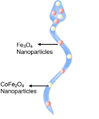 TriMag microrobots are printed from a PEGDA/PETA photosensitive hydrogel using two-photon polymerization. Instead of embedding opaque nanoparticles in the resin (which limits TPL), dissolved Fe and Co ions are co-printed in a transparent precursor and then converted post-printing to Fe3O4 and CoFe2O4 nanoparticles by exposure to hydroxide (e.g.,NaOH/NH4Cl). This in situ approach yields uniform nanoparticle distribution on/within the hydrogel lattice, preserving nanoscale print fidelity and enabling higher effective magnetic loading than direct nanoparticle doping or post-deposition coatings. Helical geometries (≈100 μm length) are actuated using rotating magnetic fields (Helmholtz coils) with optimized ~45° helix angle for propulsion efficiency; motion mode, speed, and trajectory are controlled via frequency and field orientation. The Fe3O4/CoFe2O4 combination balances MPI sensitivity and magnetothermal efficiency, enabling triple functionality in one microrobot. Rated at TRL 3.