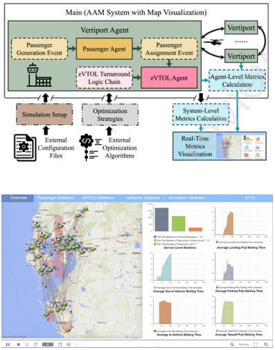 Current Advanced Air Mobility (AAM) simulation tools focus on isolated components such as airspace, vertiport sitting, or scheduling, lacking system-wide operational realism. Many platforms cannot accurately model passenger and eVTOL interactions inside vertiports or integrate external optimization algorithms. This limits stakeholders’ ability to evaluate operational strategies, identify bottlenecks, and assess scalability before real-world deployment.