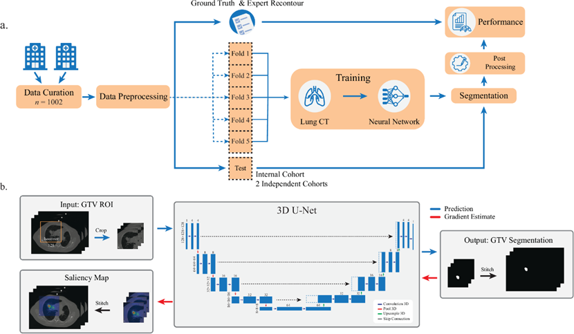 The deep learning system (iSeg) automates motion-resolved tumor segmentation for radiotherapy planning, adaptable across various tumor sites and imaging modalities. It employs a 3D U-Net convolutional neural network with an encoder-decoder architecture, trained on over 1,000 multi-institutional, physician-annotated CT datasets. The system preprocesses volumetric medical images by resampling, normalizing intensity, and stratifying by respiratory phase. It generates voxel-level probability maps for gross tumor volume (GTV) for each phase, then uses ensemble modeling to combine these into an Internal Target Volume (ITV) that accounts for respiratory motion without requiring deformable registration. Post-processing steps include morphological filtering, connected-component analysis, and smoothing. The system achieves a Dice similarity coefficient of 0.70–0.73, comparable to human inter-observer variability, and generates prognostic reports by correlating segmentation discordance with local tumor recurrence.