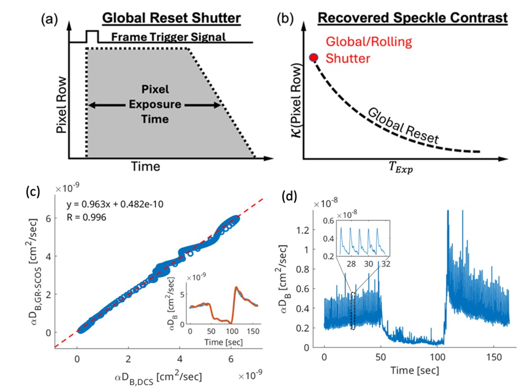 SCOS with the global reset method has (A) a range of exposure time for rows of each single frame, resulting in (B) the ability to recover speckle contrast as a function of many exposure times. This method recovers (C) absolute flow index (αDB) with high correlation to established, more complex, methods while (D) still enabling high SNR as exhibited by this arm cuff occlusion with strong blood flow pulsatility. Initial 50 seconds provide baseline blood flow, 50-100sec is response to induced ischemia in forearm, and 100-160sec is response to hyperemia. Intellectual Property: