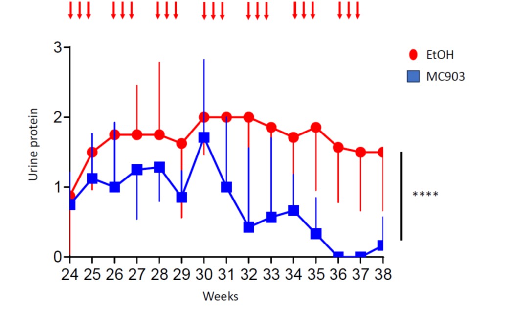 Topical MC903 protects against proteinuria in Spontaneous Lupus Model NZB x NZW F1. Mice were treated with topical application of MC903 starting at Week 24 (3 times/week; every other week). Intellectual Property: