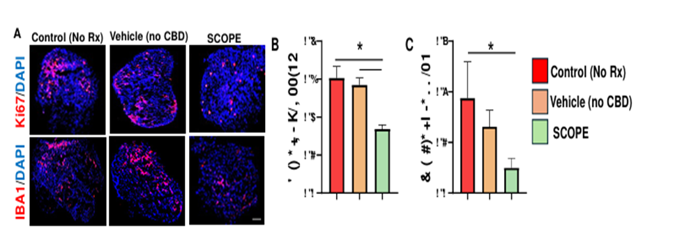 SCOPE treatment significantly reduced Ki67 and IBA1 expression in CT2A brain tumoroids. (A) Immunofluorescent images of stained cryosectioned tumoroids for Ki67 and IBA1 expressions where ki67 is the upper panel and IBA1 is the lower panel. Histogram depicting ki67 (B) and IBA1 (C) expression.